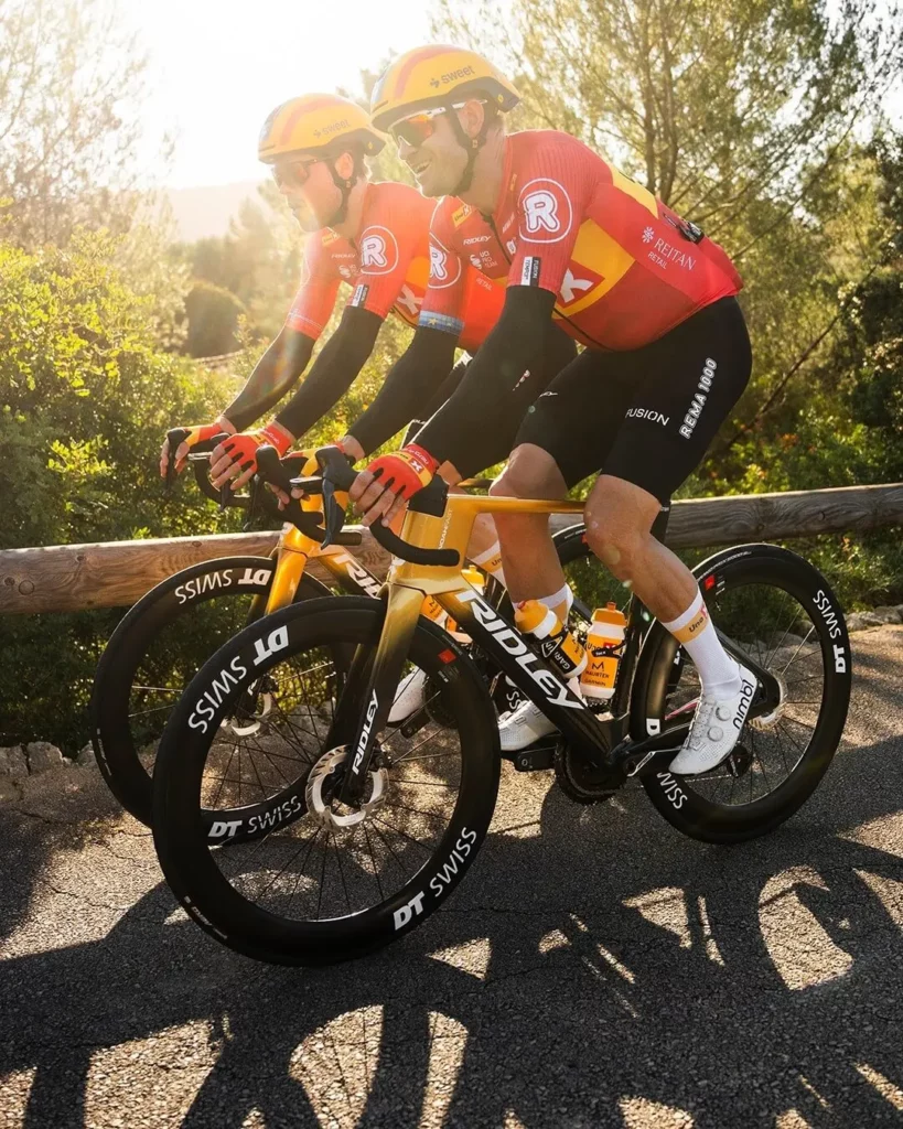 Uno-X roule sur des DT Swiss ARC 1100 personnalisées avec de gros stickers « DT Swiss », une signature visuelle qui tranche avec l’habituelle sobriété de la marque Suisse. Disponibles en profils de 50 ou 62 mm, elles exploitent un carbone haut module pour un rapport poids/rigidité impressionnant, autour de 1 492 g la paire. Les jantes, conçues avec l’expertise aérodynamique de Swiss Side, réduisent la traînée tout en restant stables sous vents latéraux grâce à une forme affinée. Les moyeux DT Swiss 180, avec leur système Ratchet EXP, offrent une réactivité instantanée et une durabilité prouvée sur les routes exigeantes du WorldTour. Une édition limitée reprenant ce design audacieux (un peu inspiré par les SES 4.5 de Pogacar ?) est probalement prévue à la commercialisation dans les prochains moins.