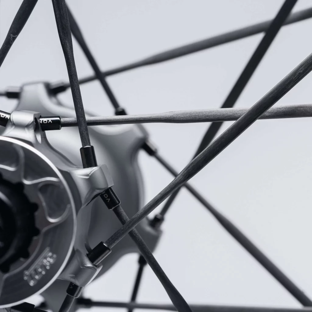 Pour accompagner ces moyeux d’exception, Reserve a fait l’impasse sur l’acier. Place aux rayons Vonoa en carbone.