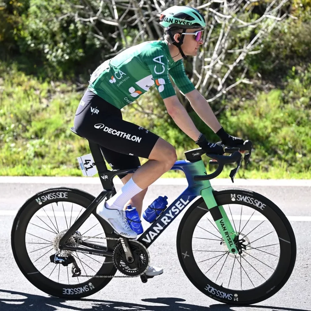 Reléguée du WorldTour à l’issue de la saison 2025, Cofidis maintient néanmoins un équipement de très haut niveau. Les Look 795 Blade RS et 796 Monoblade RS sont équipés en intégralité par Campagnolo : groupe Super Record 13, et surtout roues Bora Ultra WTO (profils 45 et 60 mm) pour la route, Bora Ultra WTO TT (lenticulaire, 930 g) pour les contre-la-montre. Les roulements CULT Campagnolo complètent un ensemble très cohérent.