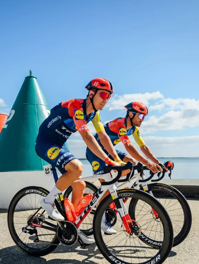 Lidl-Trek roule en configuration 100% maison : vélos Trek Madone 8 SLR, roues Bontrager Aeolus RSL et groupe SRAM Red AXS (avec capteur Quarq). La marque Bontrager appartenant à Trek, c’est une intégration verticale totale, y compris les selles et le poste de pilotage.