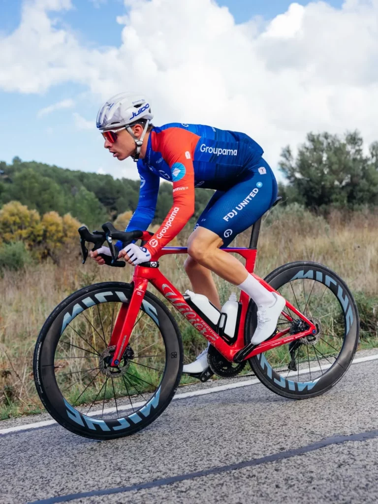 Groupama-FDJ United roule sur des Miche Deva RD pour 2026. Cette nouvelle roue représente une mise à niveau attendue; et réussie, pour la marque italienne, qui monte clairement en gamme avec ce modèle. Pour en savoir plus sur les Deva RD, retrouvez notre article dédié : Miche Deva RD : La marque italienne sort l’artillerie lourde. L’équipe de Marc Madiot a opté pour un groupe Shimano Dura-Ace Di2.