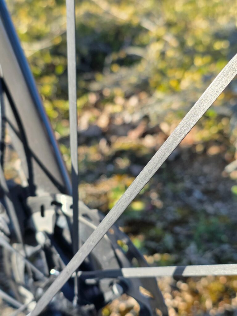 Sur le plat, le premier détail qui marque n’est pas visuel : c’est un léger sifflement caractéristique des rayons carbone à allure soutenue, même assis. Ce son discret et régulier confirme que le faible nombre de rayons est bien un choix aérodynamique assumé, et non simplement une décision de légèreté.
