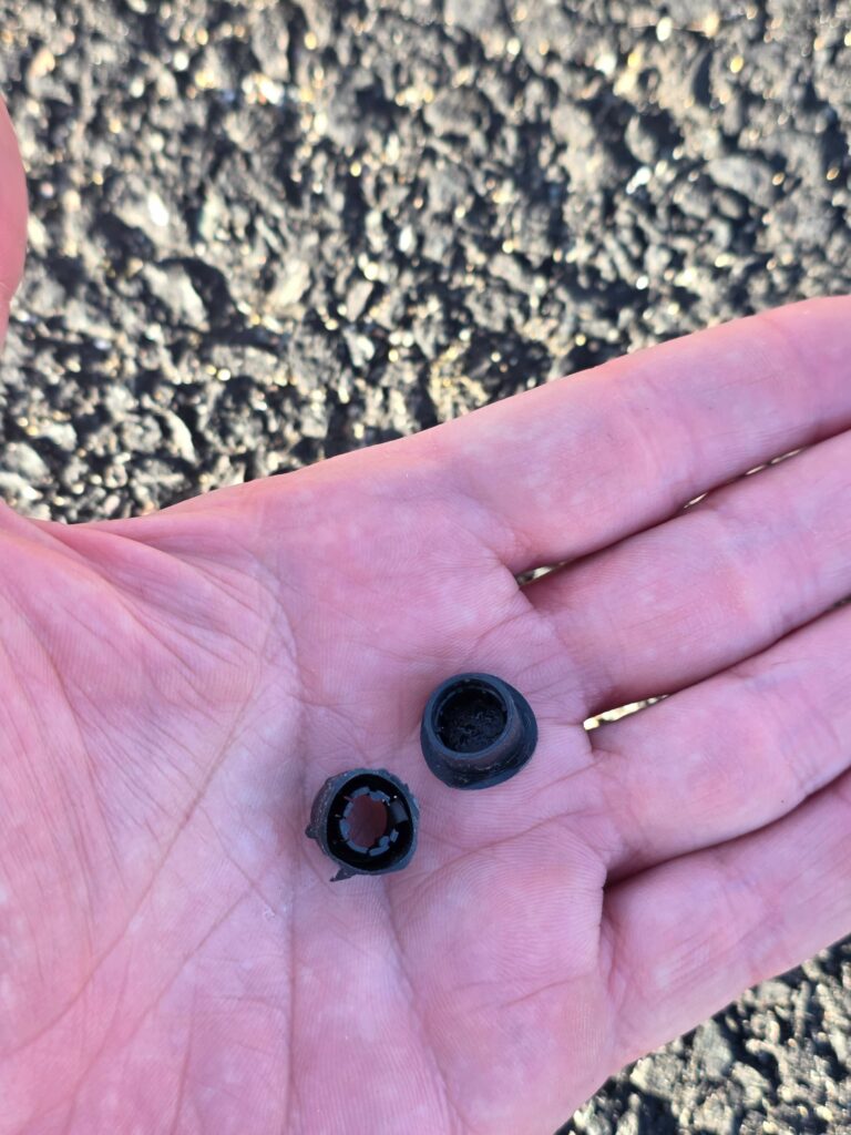 À cela s’ajoutent deux problèmes concrets avec les bouchons d’obturation qui méritent d’être documentés. Ces petits capuchons noirs, quasi invisibles sur la jante noire mate, disparaissent avec une facilité déconcertante au premier gonflage : leur petite taille et leur couleur sombre ne pardonnent pas s’ils tombent au sol. Mais le problème ne s’arrête pas là. Chaque bouchon est composé d’un corps plastique recouvert d’un joint en caoutchouc assurant l’étanchéité du trou de valve. Or, après environ 1000km, au moment de retirer le bouchon pour accéder à la valve, la partie caoutchouc s’est dissociée du corps plastique et est restée coincée dans le trou. La photo ci-dessous illustre précisément ce défaut. Ce type de défaillance sur un accessoire directement impliqué dans l’étanchéité tubeless n’est pas acceptable sur un produit à 1690€.