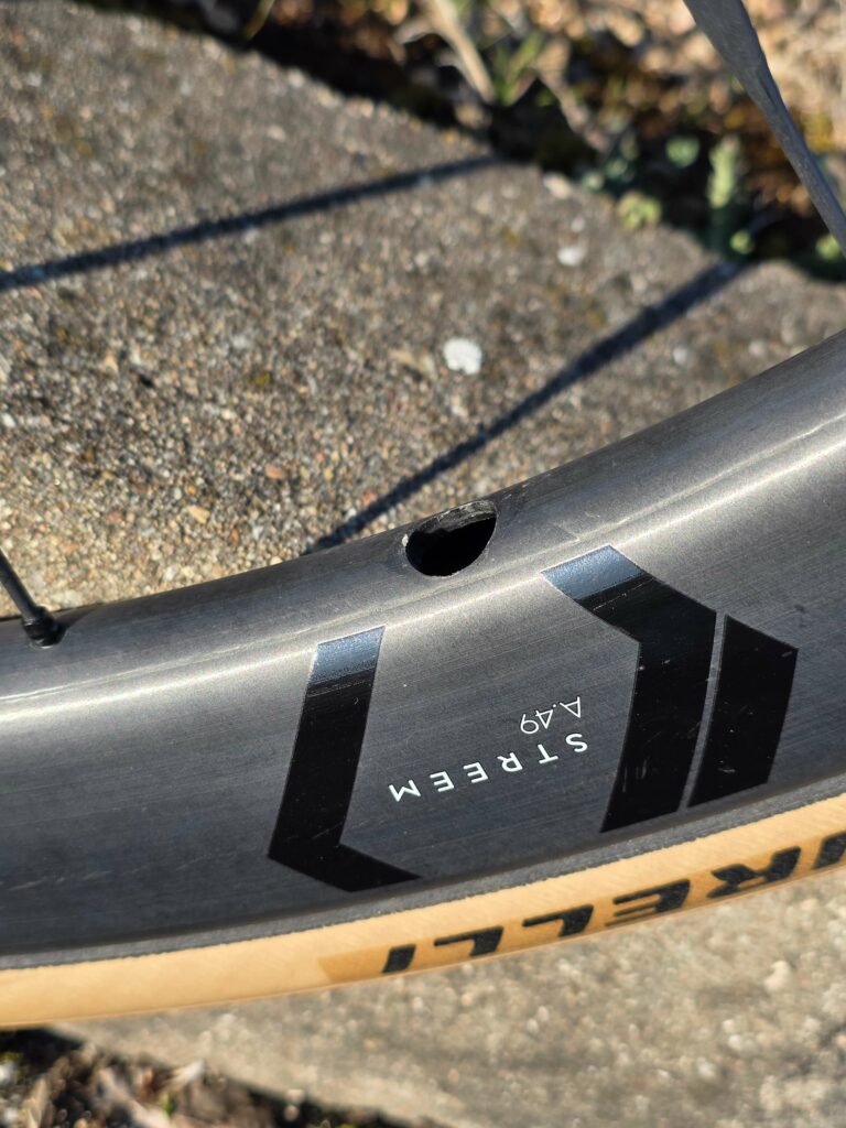 Le montage en tubetype avec les chambres Tubolito livrées avec les roues s’apprend en deux ou trois gonflages : il s’agit simplement de visser l’extension de valve depuis l’extérieur dans le bon axe. En tubeless, en revanche, la procédure devient franchement laborieuse. L’adaptateur de valve amovible, qui assure l’étanchéité depuis l’intérieur de la jante, demande un positionnement millimétrique avant de monter le pneu, et la section de la valve est trop réduite pour laisser passer le préventif liquide. En pratique : il faut démonter un côté du pneu après l’avoir claqué puis dégonflé pour y injecter le préventif, puis remonter la tringle et regonfler. Ce n’est pas impossible, mais dans un marché qui a globalement simplifié cette procédure à l’extrême, c’est un vrai point de friction.